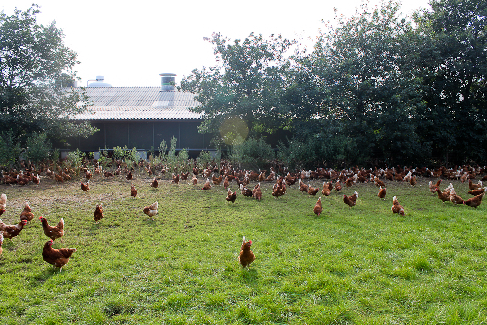 In twee stallen houden wij biologische kippen. Deze kippen hebben meer ruimte in de stal en overdag toegang tot een overdekte uitloop. Nadat ze hun biologische eieren gelegd hebben mogen ze vanaf elf uur ook rondscharrelen in de uitloopweide. Biologische kippen krijgen uitsluitend biologisch voer.